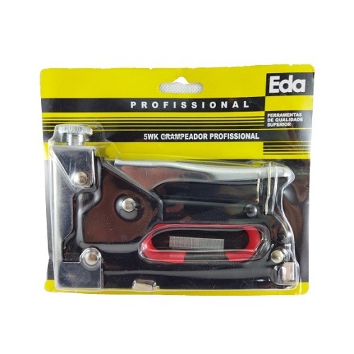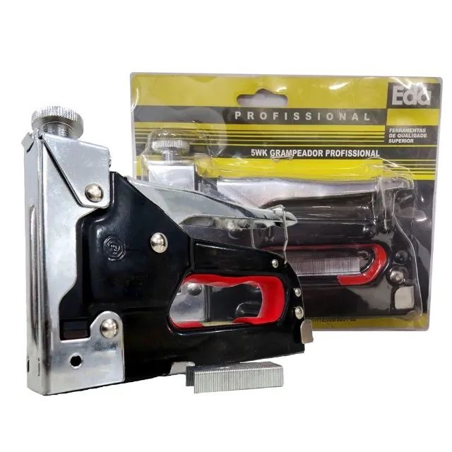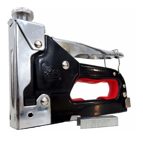 Grampeador metálico profissional de tapeceiro, resistente e de alta qualidade, ideal para fixação de materiais diversos como tecidos, plásticos e papeis em madeira, em trabalhos de tapeçaria, fixação de forros, cartazes, telas (mosquiteiros), serigrafia, vitrinismo, marcenaria, cartonagem, entre outros.